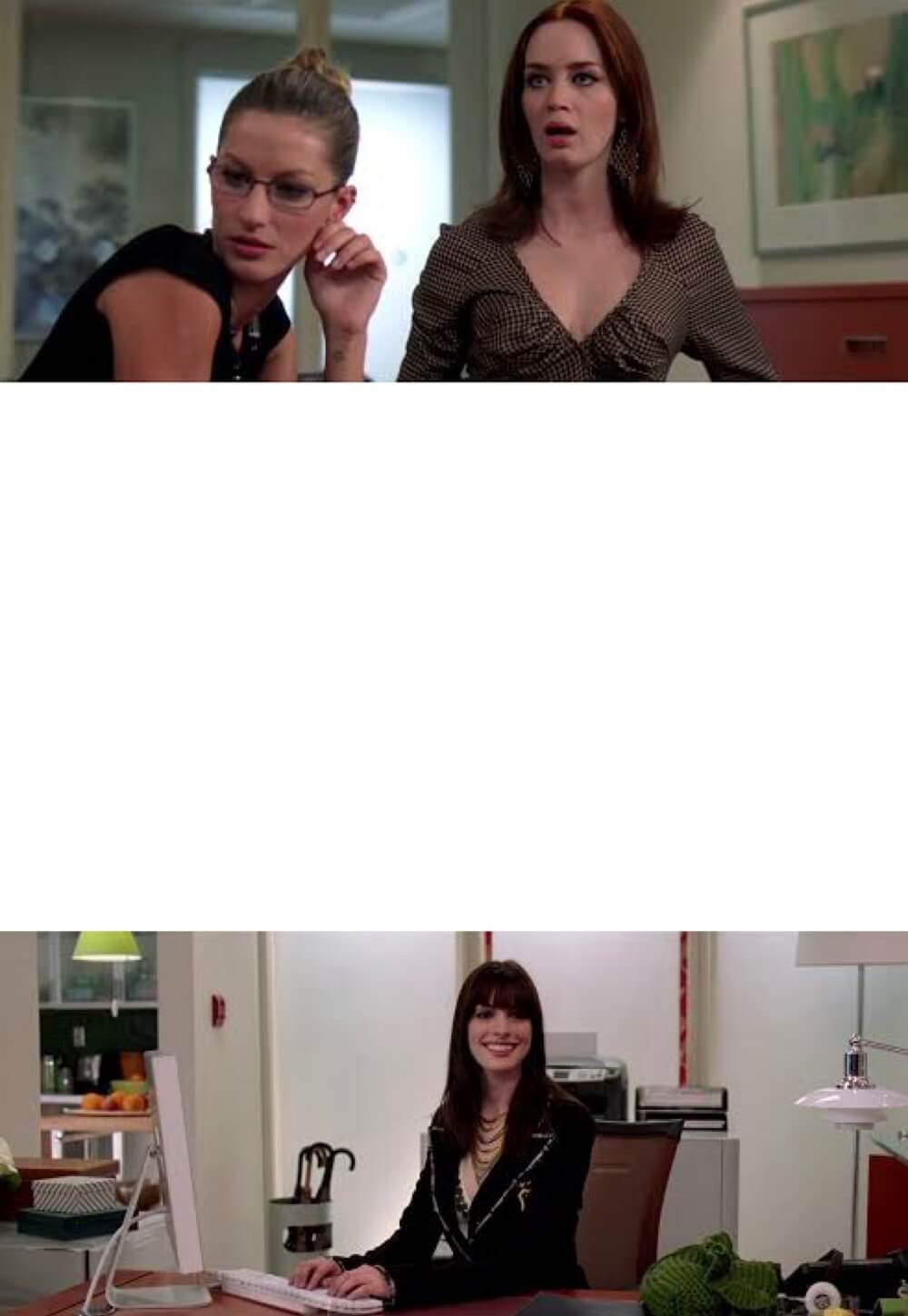 Andrea Sachs llegando a su oficina, causando envidia a sus compañeras de lo que está usando.